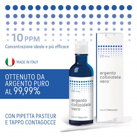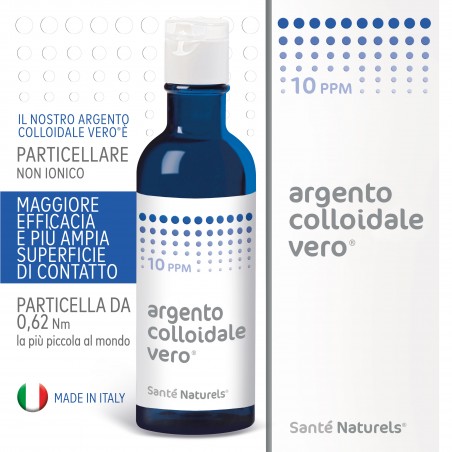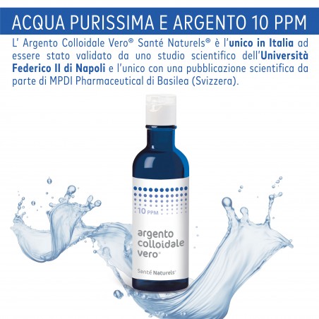 Argento Colloidale Vero® Santé Naturels® è una dispersione colloidale acquosa a base di particelle di argento metallico puro disperse in acqua ultrapura, ottenuta tramite un processo produttivo controllato e validato.