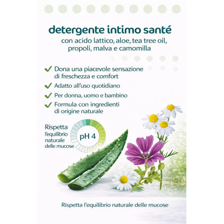 Detergente Intimo Santé è una formula cosmetica delicata, sviluppata per la detersione quotidiana dell’area intima nel rispetto del naturale equilibrio fisiologico delle mucose.