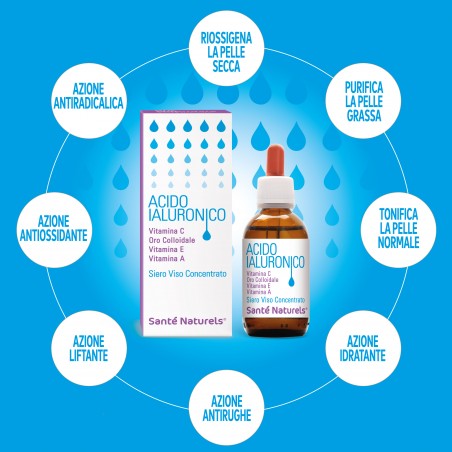 L'Acido Ialuronico è un prezioso alleato contro i segni del tempo e la naturale disidratazione. Ripristina le riserve di acqua dellapelle. Mantiene e riequilibria la barriera protettiva. Ha un'azione idratante, antirughe e liftante.