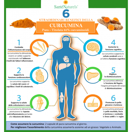 La Curcumina Santè Naturels mi ha risolto un problema di rigidità mattutina alle mani e lievi dolori artrosici. Questa nuova formulazione, inoltre, e molto comoda visto che basta una sola pillola al giorno e non colora le mani.
