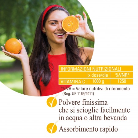 Contenuto: 250 o 500 g in polvere di Vitamina C (Sodio L-Ascorbato purissimo. Qualità DSM®).