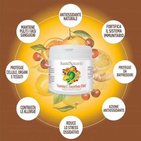 La Vitamina C è naturalmente presente in molti tipi di frutta e verdura. Ha note proprietà antiossidanti. Rafforza il sistema immunitario proteggendolo da raffreddori, tosse, febbre, mali di stagione ed ha effetti benevoli su tutto l'organismo.